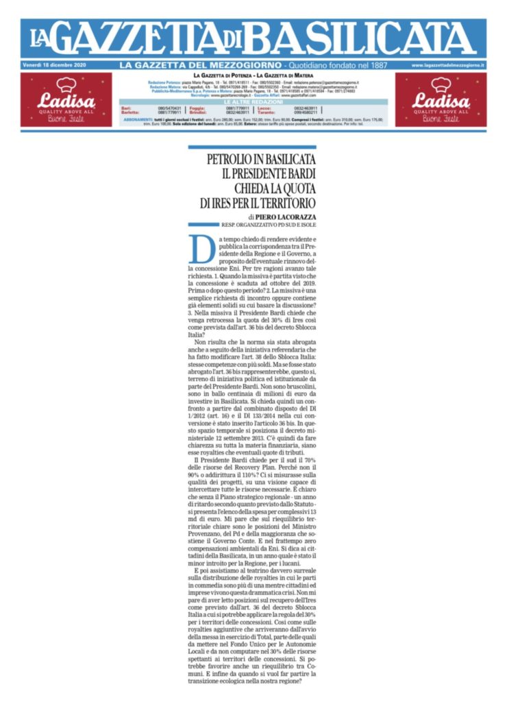 Da tempo chiedo di rendere evidente e pubblica la corrispondenza tra il Presidente della Regione e il Governo, a proposito dell’eventuale rinnovo della concessione ENI.