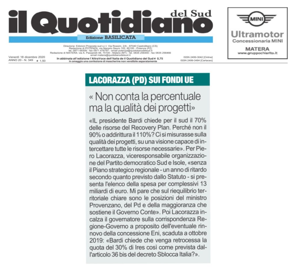 Il Presidente Bardi chiede per il sud il 70% delle risorse del Recovery Plan. Perché non il 90% o addirittura il 110%? Ci si misurasse sulla qualità dei progetti, su una visione capace di intercettare tutte le risorse necessarie. È chiaro che senza il Piano strategico regionale – un anno di ritardo secondo quanto previsto dallo Statuto – si presenta l’elenco della spesa per complessivi 13 md di euro. Mi pare che sul riequilibrio territoriale chiare sono le posizioni del Ministro Provenzano, del Pd e della maggioranza che sostiene il Governo Conte.