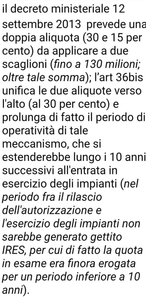 Non mi pare di aver letto posizioni sul recupero dell’IRES come previsto dall’art. 36 del decreto Sblocca Italia a cui si potrebbe applicare la regola del 30% per i territori delle concessioni. Cosi come sulle royalties aggiuntive che arriveranno dall’avvio della messa in esercizio di Total, parte delle quali da mettere nel Fondo Unico per le Autonomie Locali e da non computare nel 30% delle risorse spettanti ai territori delle concessioni. Si potrebbe favorire anche un riequilibrio tra Comuni.